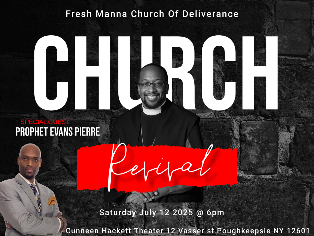 Prophet Evans Pierre will be a guest speaker at Fresh Manna Church of Deliverance. 6:00pm. Location:Â Cunneen Hackett Theater, 12 Vasser St. Poughkeepsie, NY |